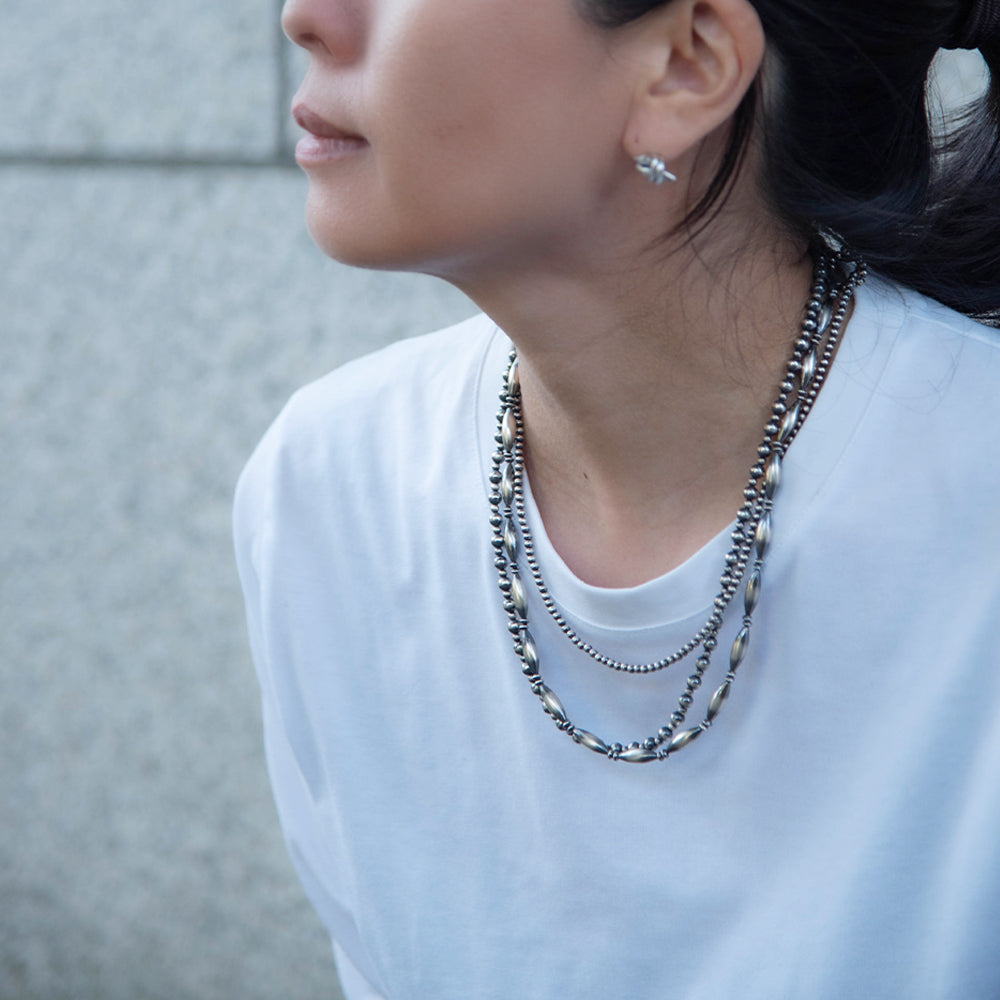 ナバホパール 伝統と品格をまとった一粒一粒の輝き ナバホパールは、ナバホ族の文化と職人技が融合した特別なジュエリーです。一粒一粒丁寧に手作りされたシルバービーズは、ただのアクセサリーを超えて、調和と美をあなたの装いに添える存在です。 カテゴリの魅力 温もりとクラフトマンシップ ナバホパールは、職人が手作業で仕上げた一品。量産品にはない温かみと独特の輝きが魅力です。 多彩なスタイリング カジュアルからフォーマルまで幅広いシーンに対応。ナバホパールのビーズネックレスは、日常使いにも特別な日にもぴったりです。 意味のあるジュエリー ナバホ族の「ホジョ」—調和と美—の精神を象徴するナバホパール。身に着けることでその願いを共有し、心に響く特別な価値を感じられます。 カテゴリ内のラインナップ 40cm~55cmの長さで幅広いスタイルに対応したネックレスをはじめ、手首に巻いてブレスレットとしても活用できるデザインが揃っています。サイズやデザインのバリエーション豊富なので、きっとあなたにぴったりの一品が見つかります。