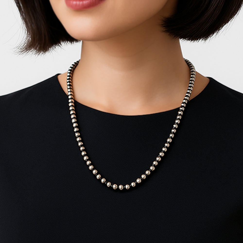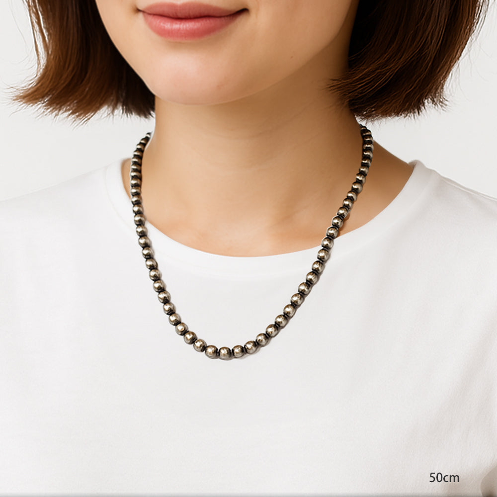 ナバホパールは、ナバホ族の手によって一つ一つ丁寧に作られ、その独特な輝きは、あなたの装いに洗練された美しさをもたらします。インディアンジュエリーの中でも特に人気があり美しいシルバービーズです。丸型のシルバービーズネックレスは、クラシックなスタイルでどんな装いにも合わせやすく、その中でも燻しタイプのビーズは、アンティークな風合いで落ち着いた印象を与えます。