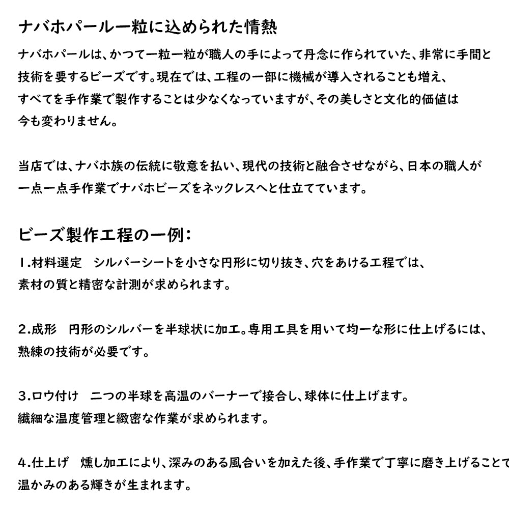 ナバホパールは、ナバホ族の「ホジョ」—調和と美—の精神を象徴しています。美しいインディアンジュエリーのビーズ一つ一つには、美しい日々と調和の中で生きるという願いが込められており、それを身につけることで、その願いを共有することができます。