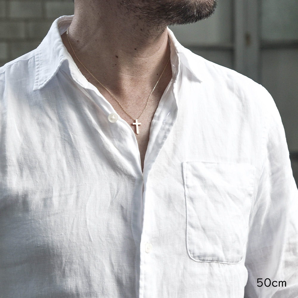 縦・横・厚みともに、ミニクロスの約2回り大きく設計されたクロスは、視覚的にも力強く、スタイルの主役に。 チェーンは基本45cm(首周り40cmで鎖骨位置)で、50cm・55cm・60cmなどカスタマイズ可能。 体型やファッションに合わせて選べるので、一生もののネックレスとしておすすめです。