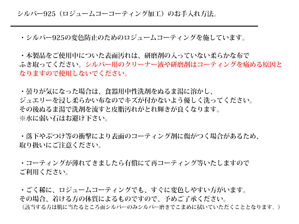 ※ロジウムコーティングとはホワイトゴールドの最終仕上げに利用するコーティングで、シルバーに施すことによりシルバー独特の変色を抑えられます。お手入れに研磨剤が不要で柔らかい布で拭くだけで美しさを保てます。